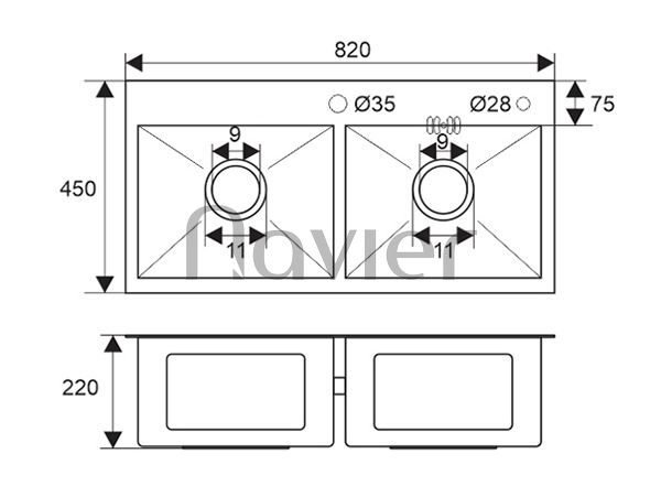 Chậu chén 2 ngăn đều Inox304 thường Navier NV-8245D